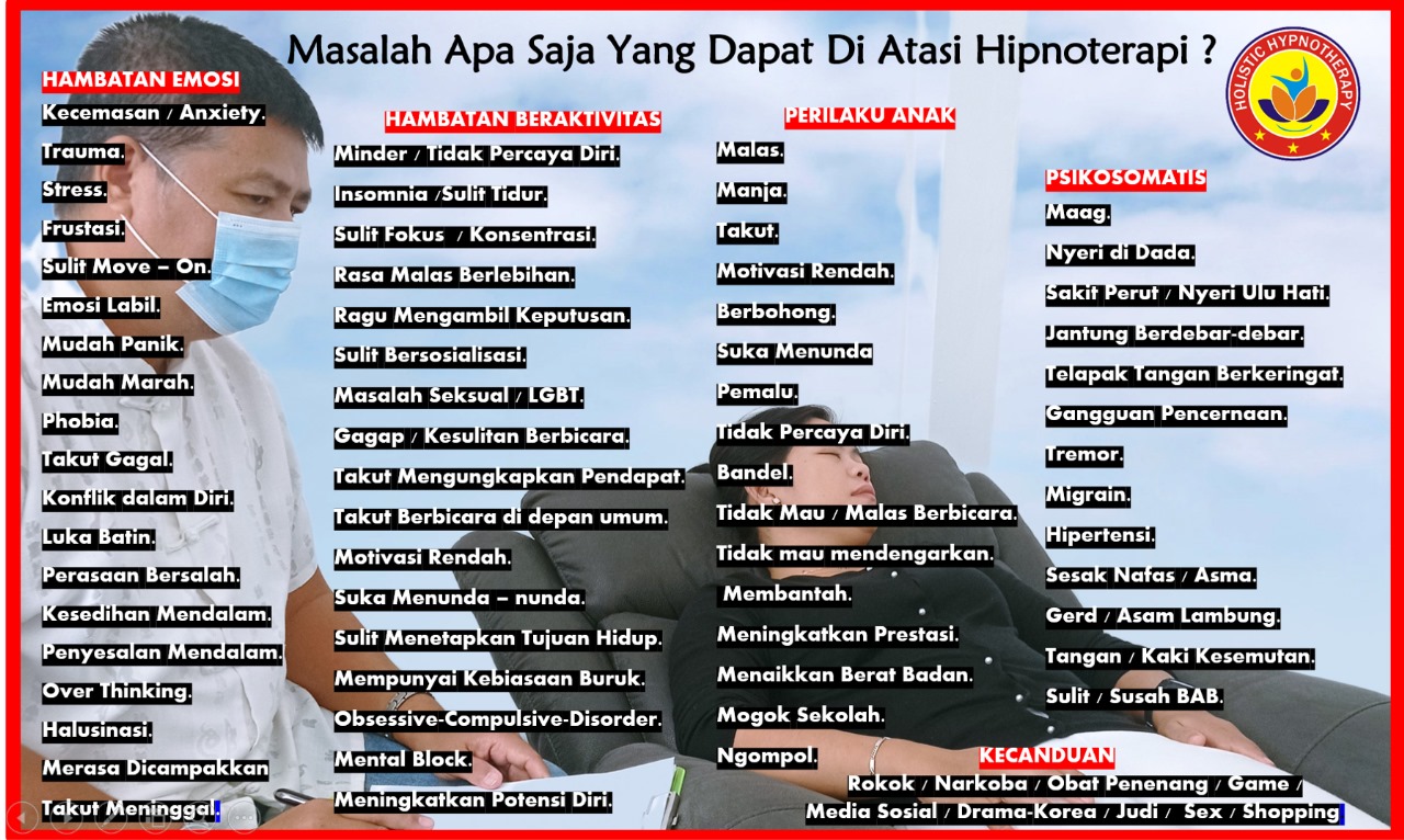 Layanan hipnoterapi untuk membantu mengatasi permasalahan/gangguan yang berhubungan dengan pikiran, perasaan dan perilaku dengan menggunakan teknik hipnosis dan mind programing lainnya.